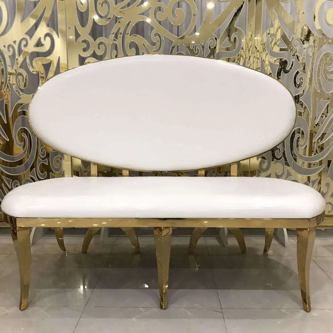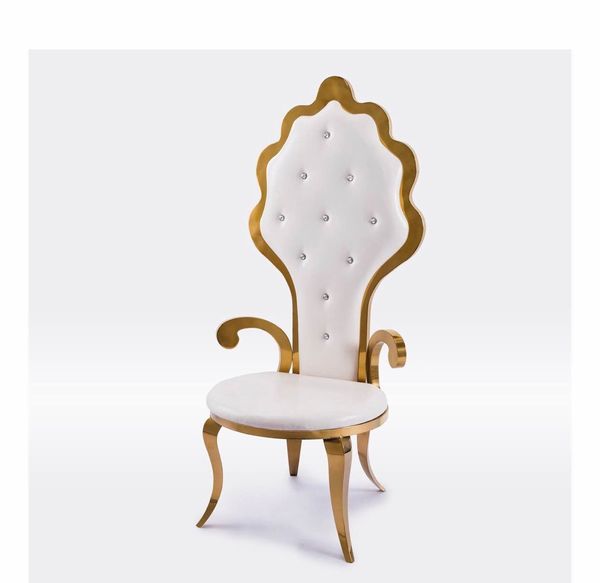 "Gold Finished Stainless Steel chair and sofa impresses with a slimming, regal-style backrest and an elegant crown-like accent. Made with a white seat cushion, the chair offers maximum comfort for bride and groom chairs or for other celebrants. Its chic and distinguished design gives a perfect finishing touch to this luxurious bride and groom chair.