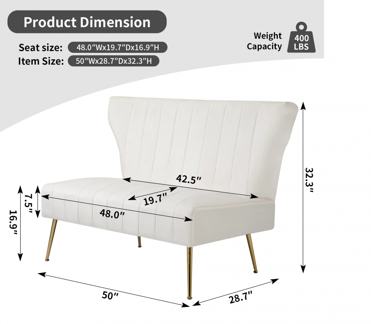 48" X wide 32.3 " Height Upholstered Velvet Love Seat Sofa, Metal legs elegantly flared and adorned with a gold finish. 48" wide 69 " Height